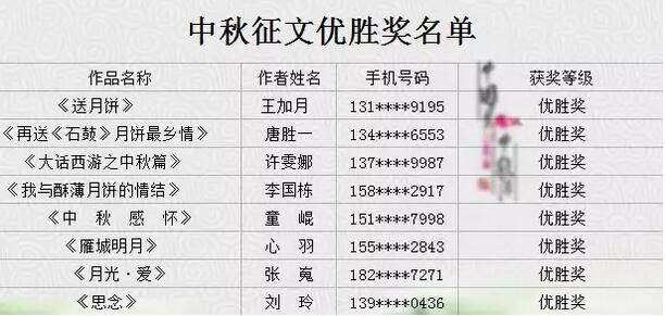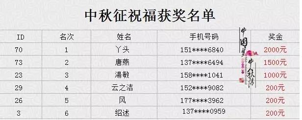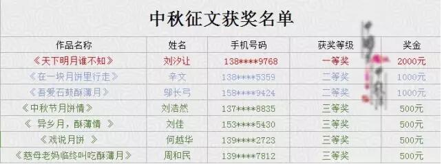 中秋有獎?wù)魑?、征祝?;顒宇I(lǐng)獎金名單公布啦??! 快往下拉↓↓↓↓ 征祝福領(lǐng)獎金人員名單: 征文領(lǐng)獎金人員名單: 征文獎金領(lǐng)?。?月16日在衡陽市職業(yè)經(jīng)理人協(xié)會,衡陽市非物質(zhì)文化保護(hù)協(xié)會舉辦的活動“十五的月亮十六圓”活動現(xiàn)場,各位獲獎的小主請耐心等待,活動主辦方屆時會電話通知各位來領(lǐng)取,咨詢電話:0734-8226685,任經(jīng)理:13723831898。 征文優(yōu)勝獎名單: 獲得優(yōu)勝獎的小伙伴們可以得到的獎品是南北特石鼓牌酥薄月(精裝鐵盒)一盒哦! 領(lǐng)獎地址:蒸陽南路20號(岳屏公園東門斜對面)。